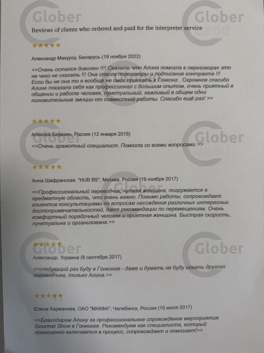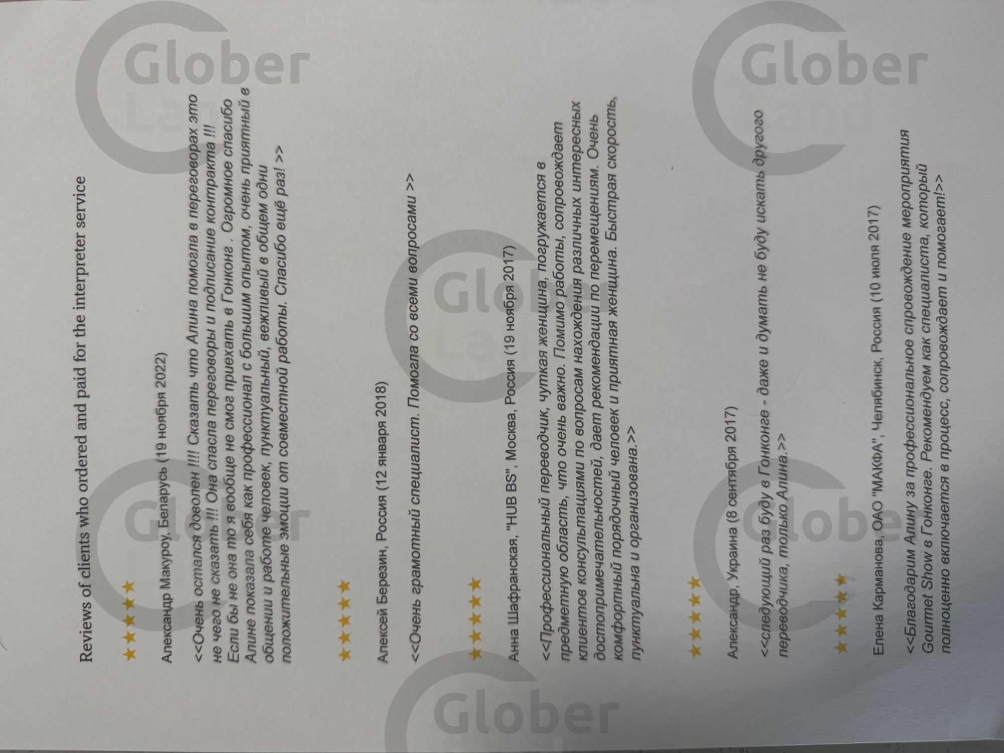 Я профессиональный переводчик-фрилансер, живущий и работающий в Гонконге с 2008 года. Я предоставляю устный и письменный перевод с английского языка на русский и с русского на английский языки. Владею базовым китайским языком для общения с местными жителями. Имею большой опыт общения с носителями английского языка, включая американцев, британцев, австралийцев, шотландцев и т.д. Имею отличные коммуникативные навыки общения на русском и английском языках.