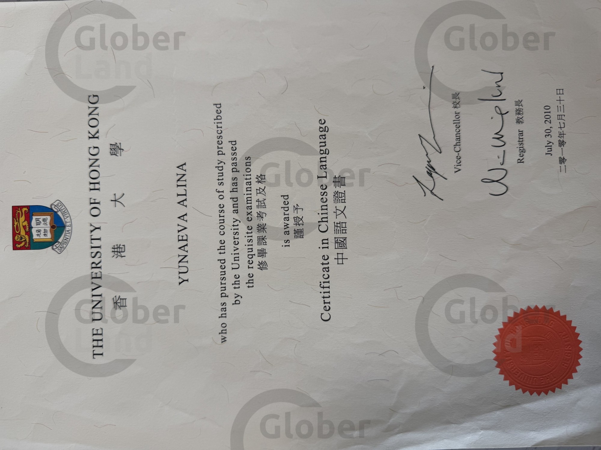 Университет Гонконга "Сертификат китайского языка", 2008 - 2011 год