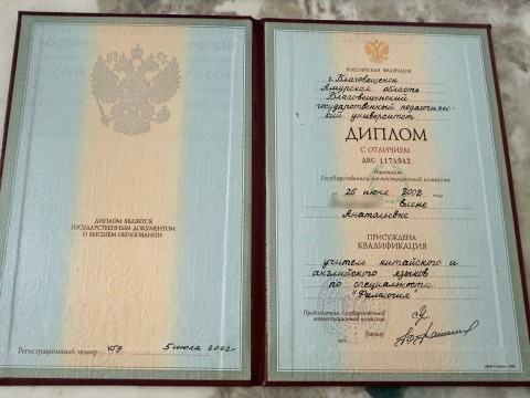 Специальность: преподаватель китайского и английского языков по специальности филология, лингвист