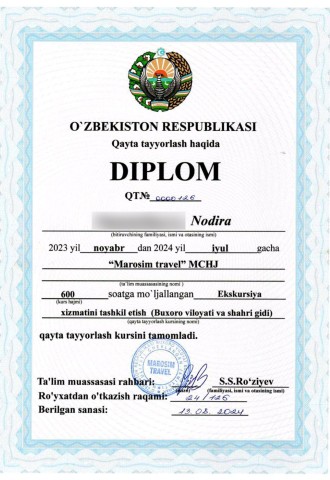 Меня зовут Нодира — я гид по Бухаре с опытом более 120 проведённых экскурсий и 5-летним стажем путешествий. Я провожу туры по самым знаковым местам Бухары и её окрестностей: медресе, мавзолеям, караван-сараям и другим архитектурным памятникам, в которых оживает история Востока.Я превращаю экскурсию в настоящее путешествие во времени, где гости становятся частью исторических событий. Для меня важно, чтобы каждый гость чувствовал себя комфортно, был вовлечён в процесс и уехал не только с красивыми фотографиями, но и с глубокими впечатлениями.